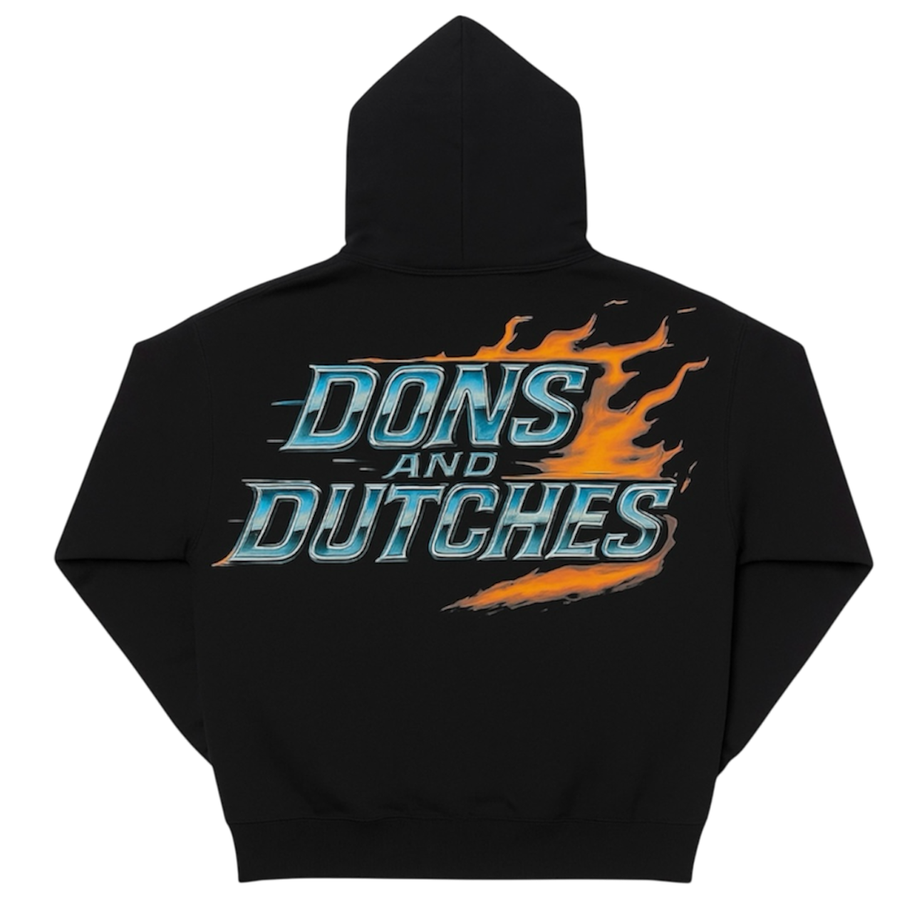 The front features a minimal white Dons & Dutches chest print, keeping the look clean and authoritative. The back carries the full statement—an oversized Ignited Dons & Dutches flame graphic, designed with high-impact color, motion, and depth, giving the hoodie its signature “on fire” presence.